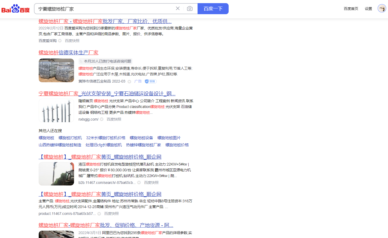 3官網(wǎng)優(yōu)化:寧夏螺旋地樁廠家、寧夏光伏支架安裝、寧夏石油儲(chǔ)運(yùn)設(shè)備設(shè)計(jì)等關(guān)鍵詞均在百度首頁展現(xiàn),投放至今搜索效果明顯。